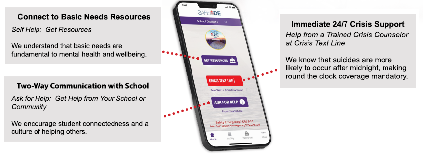 Support and Resources for Students, Staff, and Families. Delivered on our state-of-the-art platform, SAFE DE provides the connection to support and resources (unique to communities), delivered clearly and consistently to all schools and families. The healing-centered, intuitive interface builds agency by providing choice while maintaining privacy.